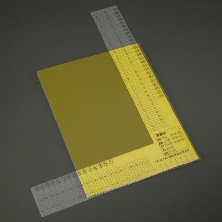 ①計測する本の右下角と、計測定規の右下角を合わせて置きます。 ②高さを計る際には、定規の四角いマスで囲まれた数字を確認します。 ③横の長さを計る際には、線の間にある数字に、背の厚みの分の長さを加えるだけで、必要なサイズが計れます。