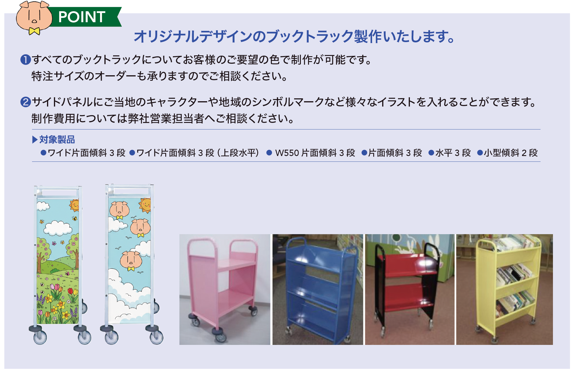 サイドパネルをご当地のキャラクターや図書館のイメージイラストなどで装飾可能です。デザインデータをご提供のうえご相談ください。