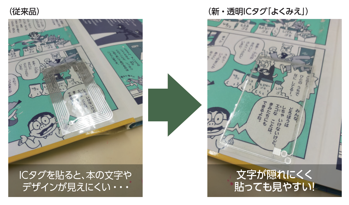 ①従来の透明ICタグに比べて、アンテナ部分の面積が少なく絵や文字も見やすい